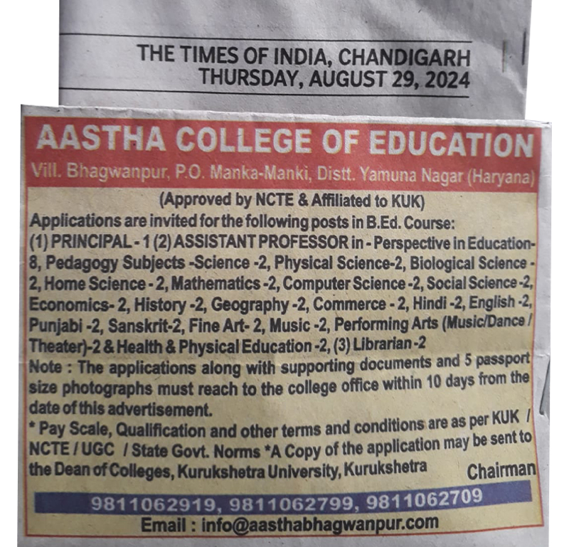 Faculty and other positions at the Aastha College of Education are advertised in newspapers as well as displayed on this website. If you would like to be considered for a faculty position, please fill online application form and along with it also attach your updated C.V.